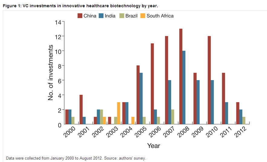 已公布的研究數(shù)據(jù)可靠性也不強,以中國為例,只有2008年一個季度的健康領域風投研究詳細數(shù)據(jù),而且沒有將投資創(chuàng)新項目初期的風險投資從中分離出來。《自然》(生物科學篇)在2013年3月發(fā)布的《生命科學風投在新興市場》一文,收集了從2000年1月到2012年8月主要新興市場生命科學領域的風險投資案例。