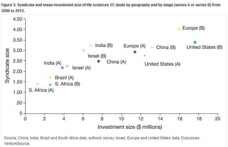 生命科學領域的生物醫(yī)藥公司缺乏風投反映了早期產品研發(fā)的巨大風險性。為此,投資市場也興起了一股聯(lián)合風:基金聯(lián)合體(眾多風投基金投資于一個項目)。盡管基金聯(lián)合體在美國和歐盟已經(jīng)很成熟,但是在中國和印度才剛剛起步。基金聯(lián)合體充當了一個早期研發(fā)助推器的作用,一方面能夠為早期項目提供源源不斷的資金,同時也能夠降低風險,促進知識產權共享。如果考察基金聯(lián)合體的規(guī)模和總體風投規(guī)模,可以發(fā)現(xiàn)兩者之間存在著強烈的正相關。