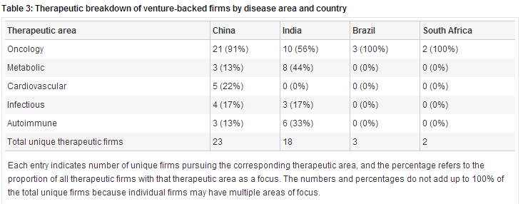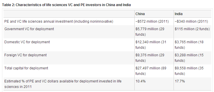 與普遍認為的"新興市場生命科學領域VC和PE活動激增"不同,該文的研究數(shù)據(jù)表明,生命科學領域創(chuàng)新性投資一直處于停滯狀態(tài),從報告的116家VC基金支持的創(chuàng)新公司融資來看,其中有76家公司為上市公司,市值為1.065萬億美元。數(shù)據(jù)方面,作者估計從2000年開始到2012年8月,VC和PE總共在生命科學公司創(chuàng)新性方面投資了1.618萬億美元到1.724萬億美元之間,在數(shù)量上有25%-30%發(fā)生在印度和中國的過去五年間。相比之下,美國在2011年第三季度就有1.1萬億美元基金投資于96家生命科學公司。
