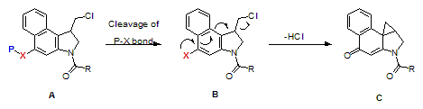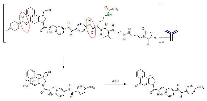 duocarmycin前藥體系的關(guān)鍵是以下化學(xué)轉(zhuǎn)化。如下圖所示, 前藥duocarmycin(A)和其它ADC體系不同,duocarmycin衍生物是以被保護(hù)的形式(化合物A)存在,通過選用不同的保護(hù)基P還可以得到具有不同成藥性的化學(xué)分(例如高水溶性)。保護(hù)基在腫瘤細(xì)胞內(nèi)被裂解,比如氧、氮等富電子官能團(tuán)從而按圖所示,推動電子轉(zhuǎn)移并致使氯原子脫離,形成一個含有三元環(huán)的生物活性分子(化合物C)。