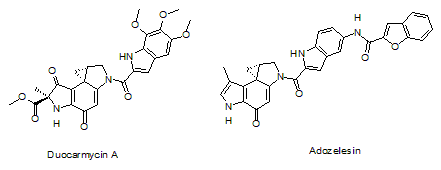 Synthon抗體藥物偶聯(lián)物(ADC)的制導(dǎo)部分采用靶向人類表皮生長因子受體2(HER2)的曲妥單抗(trastuzumab),效應(yīng)分子是以duocarmycin為母核的前藥。盡管Synthon制藥公司還沒有披露他們偶聯(lián)物的具體化學(xué)結(jié)構(gòu),根據(jù)藥源判斷,其設(shè)計原理應(yīng)該基于DNA小溝烷基化制劑duocarmycin的前藥體系。如下圖所示,duocarmycin是包括duocarmycin A(左首結(jié)構(gòu)式),B1,B2,C1,C2,D,SA和CC-1065等一系列從鏈霉菌提取的天然產(chǎn)物的衍生物,這類化合物能特異性地識別DNA小溝,并有效地烷基化DNA堿基N3位的腺嘌呤,具有很高的抗癌活性。遺憾的是這類衍生物同樣具有較高的毒性。Dale Boger及同事對這類天然產(chǎn)物做過大量研究,合成了多個類似物進(jìn)行篩選活性高,毒性低的化合物以便用于臨床,其中Adozelesin(右首化學(xué)結(jié)構(gòu)式)、Blzelesin和Carzelesin已經(jīng)在多項臨床實驗中評價。