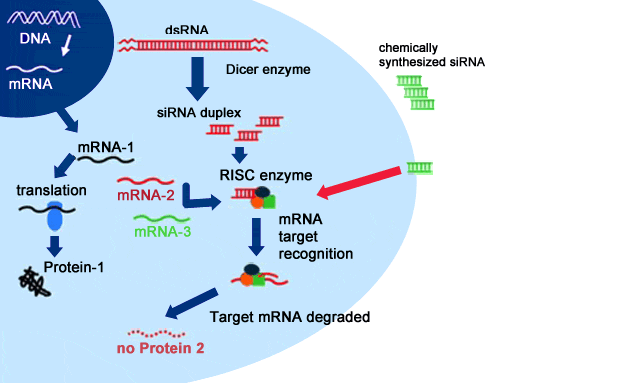 ? 和mRNA不同,siRNA不參與動(dòng)物體的正常生長和發(fā)育,只有在病毒或其它dsRNA誘導(dǎo)情況下才產(chǎn)生并起作用。是mRNA的完善和補(bǔ)充。