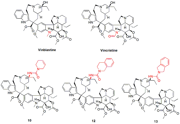 以著名化學家Dale Boger為首的美國The Scripps Research Institute (TSRI)研究團隊通過化學方法修飾長春堿C-20位的羥基發(fā)現(xiàn)了一組脲類衍生物(化合物10、12和13),這些化合物的抗癌活性對測試的15種細胞株的活性和長春堿相比要高10到200倍,甚至包括那些P-糖蛋白(PgP)過度表達的,并對長春堿耐藥的細胞株。體外實驗表明,這些化合物對微管蛋白的親和力要高于長春堿,說明這類長春堿衍生物也是通過抑制微管形成產(chǎn)生作用。這些結(jié)果發(fā)表的最新一期的ACS Med. Lett.上。