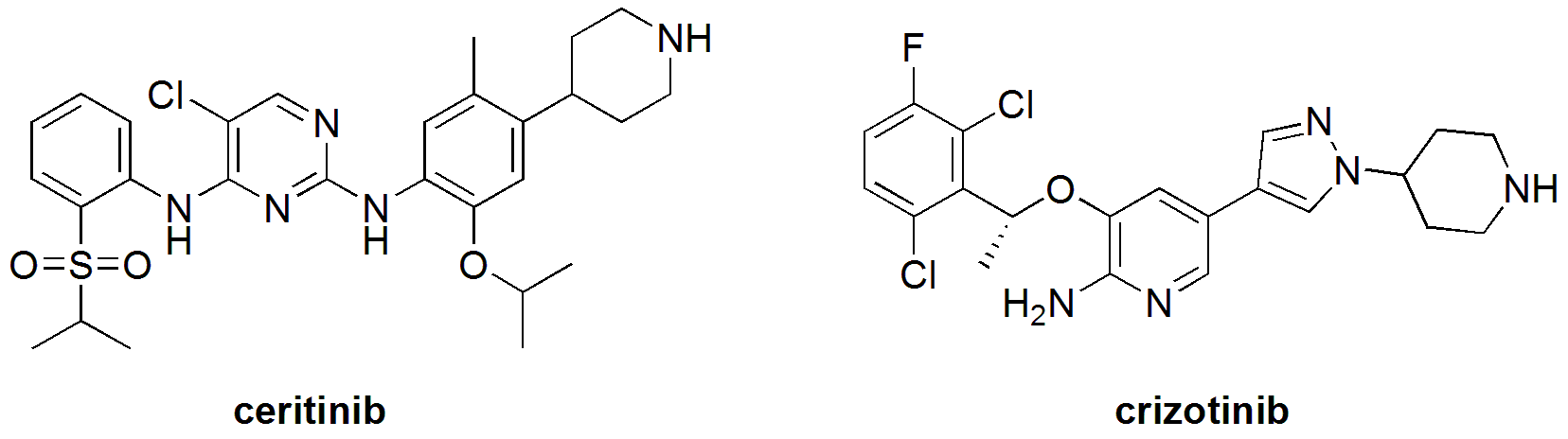 開發(fā)共價鍵/不可逆抑制劑是克服蛋白激酶抑制劑耐藥的一個常見手段。但是ceritinib和克唑替尼(crizotinib)一樣,是可逆性的間變性淋巴瘤激酶(ALK)酪氨酸激酶抑制劑,在細(xì)胞內(nèi)能選擇性地抑制EML4-ALK和NPM-ALK融合蛋白的表達(dá)。如下圖所示,雖然這兩個化合物在化學(xué)結(jié)構(gòu)上有較大差別,但抑制ALK的模式應(yīng)該類似,所以到目前為止還不清楚ceritinib避免耐藥的分子機理。