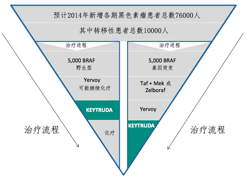 預(yù)計(jì)2014年新診斷的7萬(wàn)6千黑色素瘤患者中大約有1萬(wàn)患者是轉(zhuǎn)移性的,其中野生型或帶有BRAF V600基因突變的患者大約各占一半。經(jīng)FDA或CLIA認(rèn)證試劑盒檢測(cè)有BRAF V600基因突變患者的優(yōu)選方案有Zelboraf、Tafinlar和Mekinist復(fù)方組合,并且包括和Yervoy的聯(lián)合治療。野生型患者的一線療法主要有Yervoy,包括有或沒有后續(xù)的化療。Keytruda作為二線或三線療法被批準(zhǔn)用于治療已經(jīng)接受過ipilimumab治療但仍有進(jìn)展,或?qū)RAF V600基因變異的患者依序經(jīng)過BRAF抑制劑和ipilimumab治療但顯示耐藥的患者。據(jù)Leerink估計(jì),根據(jù)默克每位患者每月12500美元的價(jià)格,Keytruda的年銷售額預(yù)計(jì)在1億4千萬(wàn)美元左右。
