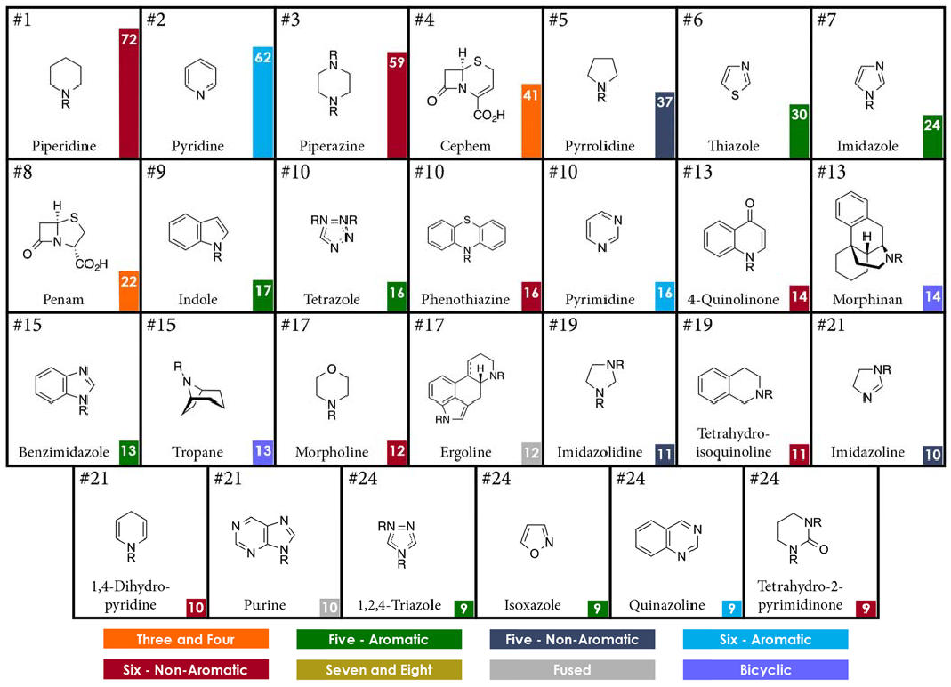 圖1、美國FDA批準上市藥物中出現(xiàn)最頻繁的前25個氮雜環(huán)結(jié)構(gòu)
