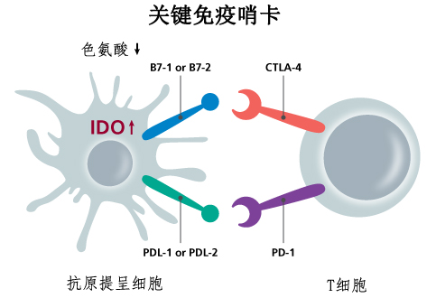 由上圖所示,吲哚胺2,3-雙加氧酶(IDO)在抗原提呈細(xì)胞尤其是漿細(xì)胞樣樹突狀細(xì)胞高度表達(dá),和最近飽受熱捧的CTLA-4、PD-1和PD-L1等一樣起著免疫哨卡的作用。IDO通路通過抑制T細(xì)胞的活化下調(diào)機體的免疫能力,是癌細(xì)胞逃脫免疫細(xì)胞攻擊的重要機制之一。研究發(fā)現(xiàn)IDO通路在多種癌癥中被激活,包括前列腺癌、結(jié)腸直腸癌、胰腺癌、子宮頸癌、胃癌、卵巢癌、頭、肺癌等過度表達(dá)IDO。