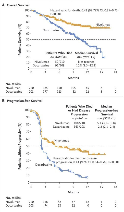 【藥源解析】: 今天發(fā)表的就是著名的所謂checkmate-066實(shí)驗(yàn)結(jié)果,比較PD-1抑制劑nivolumab和傳統(tǒng)化療藥物dacarbazine在未經(jīng)治療、無BRAF變異晚期黑色素瘤患者的療效和安全性。這個實(shí)驗(yàn)由于療效顯著在今年6月提前結(jié)束,但今天正式發(fā)表了實(shí)驗(yàn)數(shù)據(jù)。二者的數(shù)據(jù)比較如下:一年生存率73%對42%;應(yīng)答率40%對14%;無進(jìn)展生存期5.1對2.2個月;3級以上副作用:11.7%對17.6%。這是PD-1抑制劑首次在三期臨床實(shí)驗(yàn)中顯示生存療效,而且副作用低于化療。下面這條Kaplan-Meier曲線相當(dāng)震撼,對病人來說就是救命稻草,對廠家來說就是真金白銀,對科學(xué)家來說這曲線就是一個藝術(shù)品。