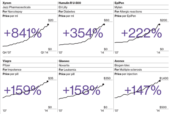 制藥工業(yè)曾經(jīng)有多年維持兩位數(shù)增長的驕人歷史,但在專利懸崖的影響下2012年美國處方藥銷售首次出現(xiàn)下滑(當年下滑3.6%),當時專家估計幾年內(nèi)處方藥將保持2-3%的下滑趨勢。那為什么短短兩年之內(nèi)就出現(xiàn)如此驚人反彈呢?一個最主要的原因是藥價的普遍上漲。不僅是sovaldi、Keytruda這樣顛覆性新藥比以前藥物價格有提高,就連在市場上多年的老藥也跟著渾水摸魚。賽諾菲的長效胰島素Lantus最近的增長主要靠藥價的提高。當然各國經(jīng)濟的逐漸復蘇使支付環(huán)境比前幾年有所緩和給藥價的提高提供了經(jīng)濟基礎。