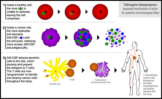 【藥源解析】T-VEC是由皰疹病毒herpes simplex 1通過基因工程改造制備的一種溶瘤病毒。T-VEC通過病灶直接給藥,注射到腫瘤組織后T-VEC起兩方面作用:雖然病毒同時(shí)侵蝕腫瘤細(xì)胞和正常細(xì)胞,但T-VEC只能在腫瘤細(xì)胞中大量復(fù)制并釋放粒細(xì)胞-巨噬細(xì)胞集落刺激因子(GM-CSF)。腫瘤細(xì)胞最終不堪重負(fù)并裂解,而正常細(xì)胞不受影響,這樣起到靶向腫瘤細(xì)胞的目的。二是表達(dá)的GM-CSF激活免疫系統(tǒng)也能起到殺滅腫瘤細(xì)胞的作用。