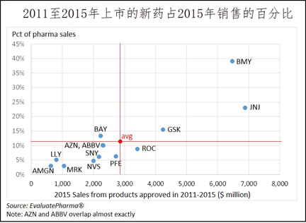 【新聞事件】:最近包括福布斯Bernard Munos在內(nèi)的多位生命科學(xué)領(lǐng)域的分析家相繼發(fā)表文章,在批評“Valeant模式”的同時也探討制藥工業(yè)的未來發(fā)展模式。比如Munos通過計算2011至2015年上市新藥占2015年銷售額的百分比指出,施貴寶和強(qiáng)生在過去5年開發(fā)的新藥銷售對公司營業(yè)額的貢獻(xiàn)最大,分別占2015年營業(yè)額的39%和22%。相反,過半制藥巨頭(6個)自2006年之后上市的新藥在2015年為公司銷售所占的貢獻(xiàn)小于22%。而2011年之后上市新藥的銷售占比甚至低于11%。