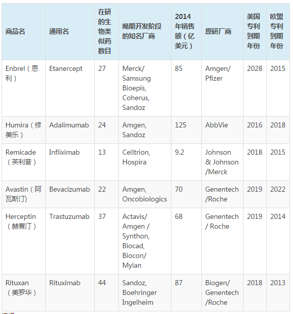 盡管生物類似藥目前的市場(chǎng)規(guī)模并不算大,只有區(qū)區(qū)幾十億美元,但是卻“熱”得燙手。國(guó)內(nèi)外許多藥企都已經(jīng)或打算進(jìn)軍生物類似藥市場(chǎng),世界著名仿制藥公司如梯瓦(以色列)、山德士(瑞士,諾華旗下)等均加大了對(duì)生物類似藥的投資力度,更有不少世界原研制藥巨頭如輝瑞(美國(guó))、默沙東(美國(guó))、安進(jìn)(美國(guó))、勃林格殷格翰(德國(guó))等也紛紛進(jìn)軍生物類似藥。就生物類似藥火熱的背后原因和驅(qū)動(dòng)因素筆者三年前曾經(jīng)問過“生物仿制藥為什么這么火?”,答案包括: 1)日益升高的新藥開發(fā)成本; 2)到期的生物藥專利;以及3)市場(chǎng)對(duì)生物藥的巨大需求。其中對(duì)專利部分的內(nèi)容,因數(shù)據(jù)已經(jīng)過時(shí),所以簡(jiǎn)單更新如下。下表是銷售額最高的六種抗體藥(其中包括Fc融合蛋白Enbrel), 藥王Humira(修美樂)在2014年的全球銷售額是125億美元,2015年更是漲到了146億美元,所以在研的生物類似藥多達(dá)24個(gè)就不奇怪了。而Rituxan (美羅華)的在研生物類似藥更是多達(dá)44個(gè)。毫無疑問,這么多的廠家扎堆少數(shù)幾個(gè)銷售額最高的藥,笑到最后的只能是“一小撮”贏家。